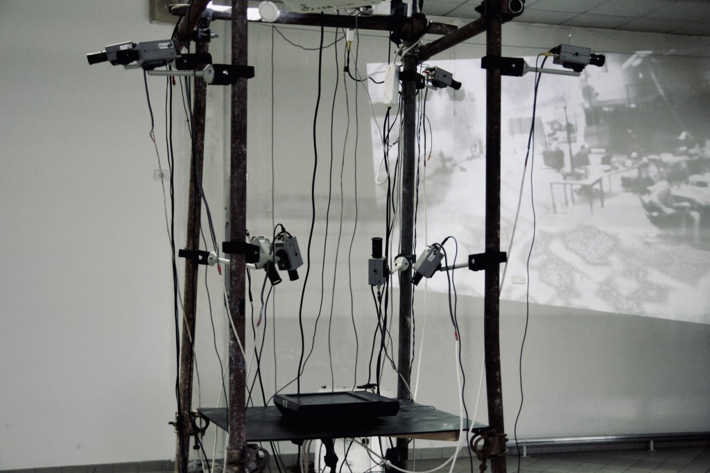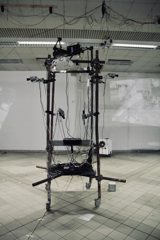 Video organism feeding of the visual surrounding, digesting the picture and projecting it on to the walls. Eight cameras, one monitor, video mixer, sequencer, four projectors. All mounted on to the tower, making a technological body that is recording, processing and shaping it’s surrounding.