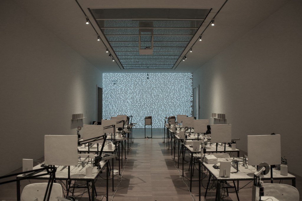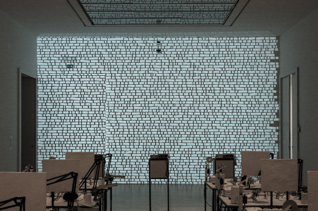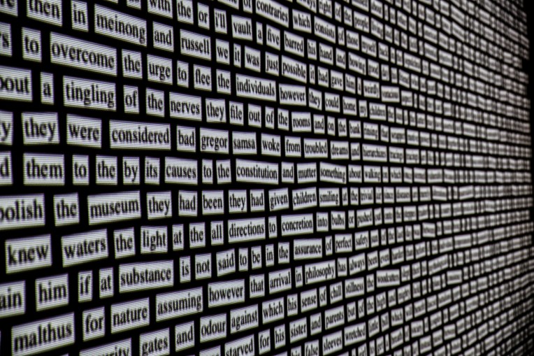 Tekstom(l)at is a real-time generated animation programmed to randomly pick parts of the given text and render them into a collaged body of words.